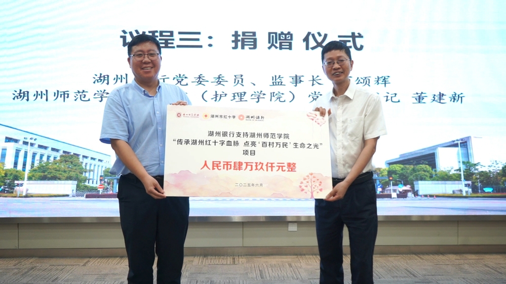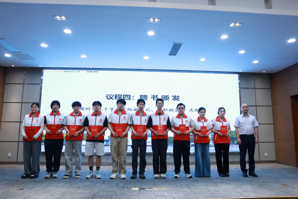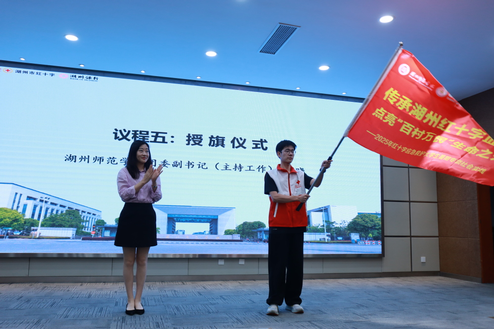 湖州银行党委委员、监事长丁颂辉为本次活动进行了捐赠,湖州市红十字会党组副书记、专职副会长沈维勇为志愿者代表颁发“‘湖州红脉 星火接力’大使”聘书。校团委副书记(主持工作)成晓为实践团队授旗,与会领导和嘉宾共同点亮启动屏幕。
