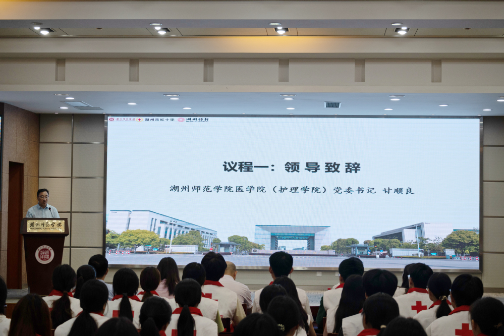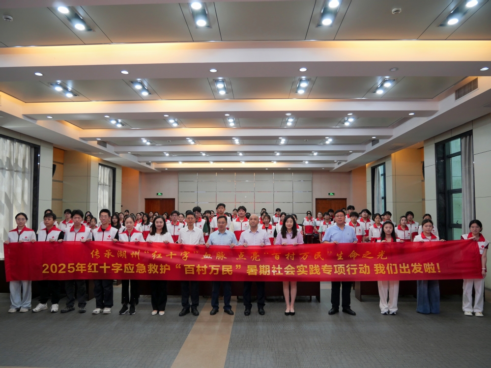 6月28日上午,我校举行“传承湖州‘红十字’血脉 点亮‘百村万民’生命之光”——2025年红十字应急救护“百村万民”大学生暑期社会实践专项行动启动仪式。湖州市红十字会党组副书记、专职副会长沈维勇,湖州银行党委委员、监事长丁颂辉;我校医学院(护理学院)党委书记甘顺良、团委副书记(主持工作)成晓、党委宣传部副部长许莹莹、医学院(护理学院)党委副书记董建新,以及100多名大学生志愿者参加本次活动。仪式由董建新主持。
