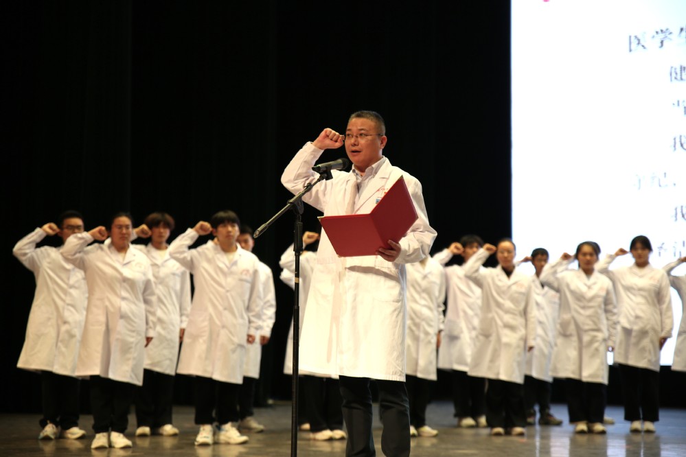 在附属中心医院副院长胡鸿宇的领誓下,2025级全体医学生庄严宣誓,铿锵有力的誓言响彻会场,这既是对医学事业的郑重承诺,更是对青春使命的庄严宣告,彰显了新一代医学生的责任与担当。