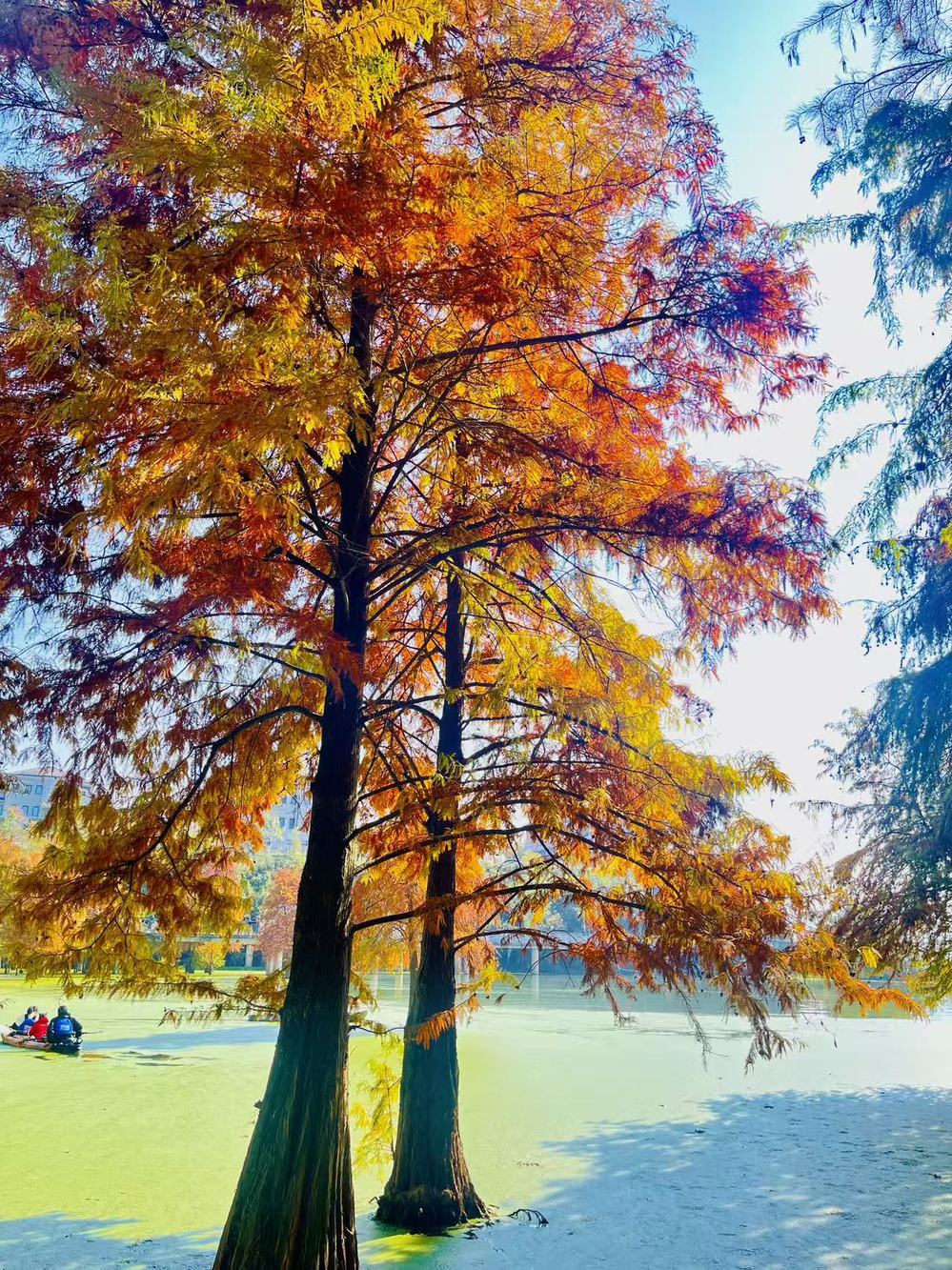 深秋时节,湖边的水杉和落羽杉层林尽染,红黄交织的枝叶倒映在清澈的湖面上,宛如一幅绚丽的画卷。老师们或漫步水上栈道,或驻足拍照留念,在轻松的交谈中享受难得的休闲时光。清澈的湖水、斑斓的杉林、清新的空气,让大家暂时放下繁忙的工作,沉浸在自然之美中。