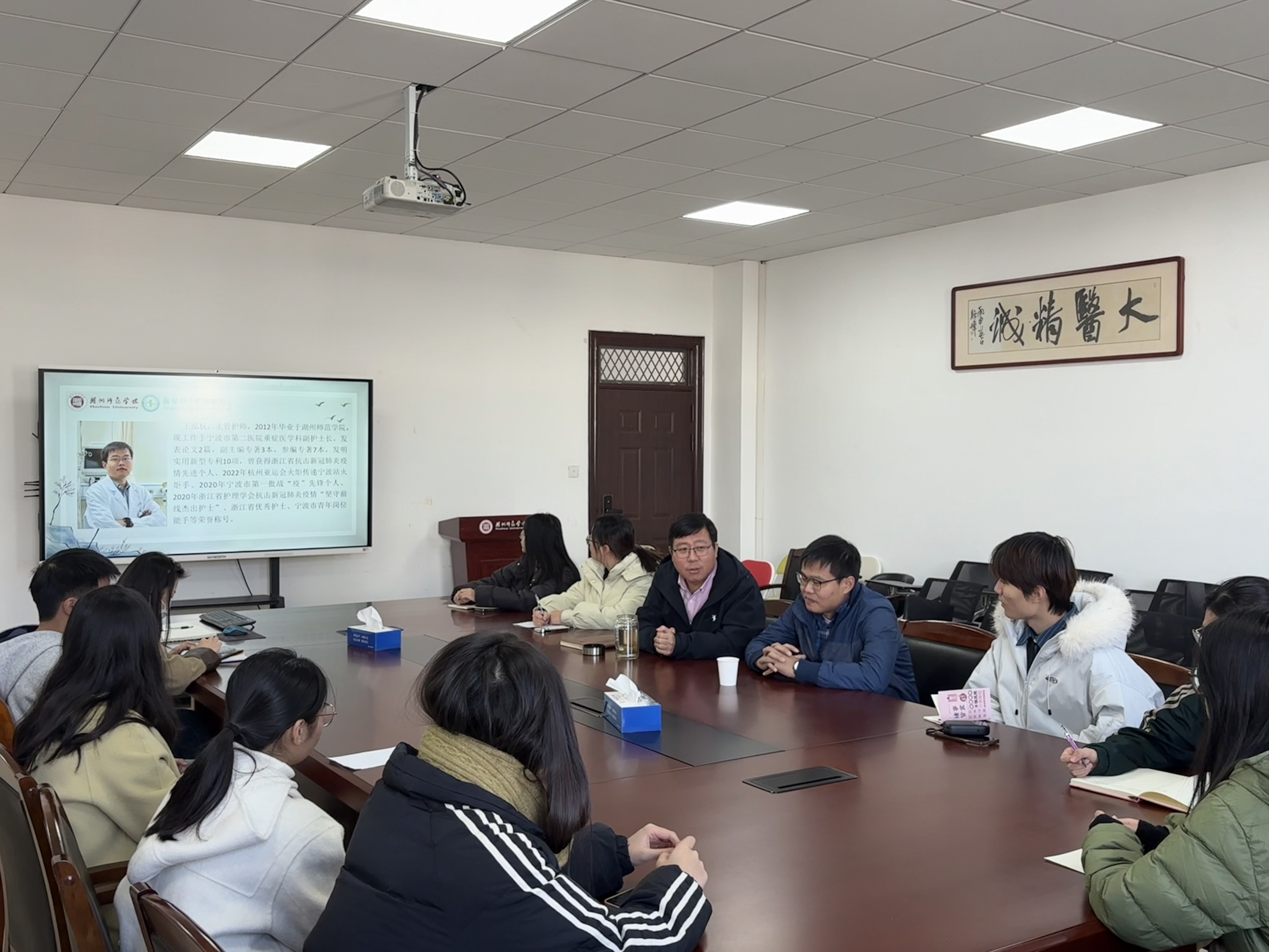2025年11月19日,湖州师范学院第五届“师院最闪亮的星”荣誉盛典隆重举行,我院优秀校友、宁波市第二医院重症医学科副护士长王泓权主管护师受邀返校,并作为主讲嘉宾出席了医学院(护理学院)第21期“优医说”活动。在医学院26-510会议室,王泓权与2025-2026年度学院团委、学生会学生骨干进行了亲切深入的座谈交流,辅导员祝丽红、汤枭一同参会。活动由医学院(护理学院)党委副书记董建新主持。