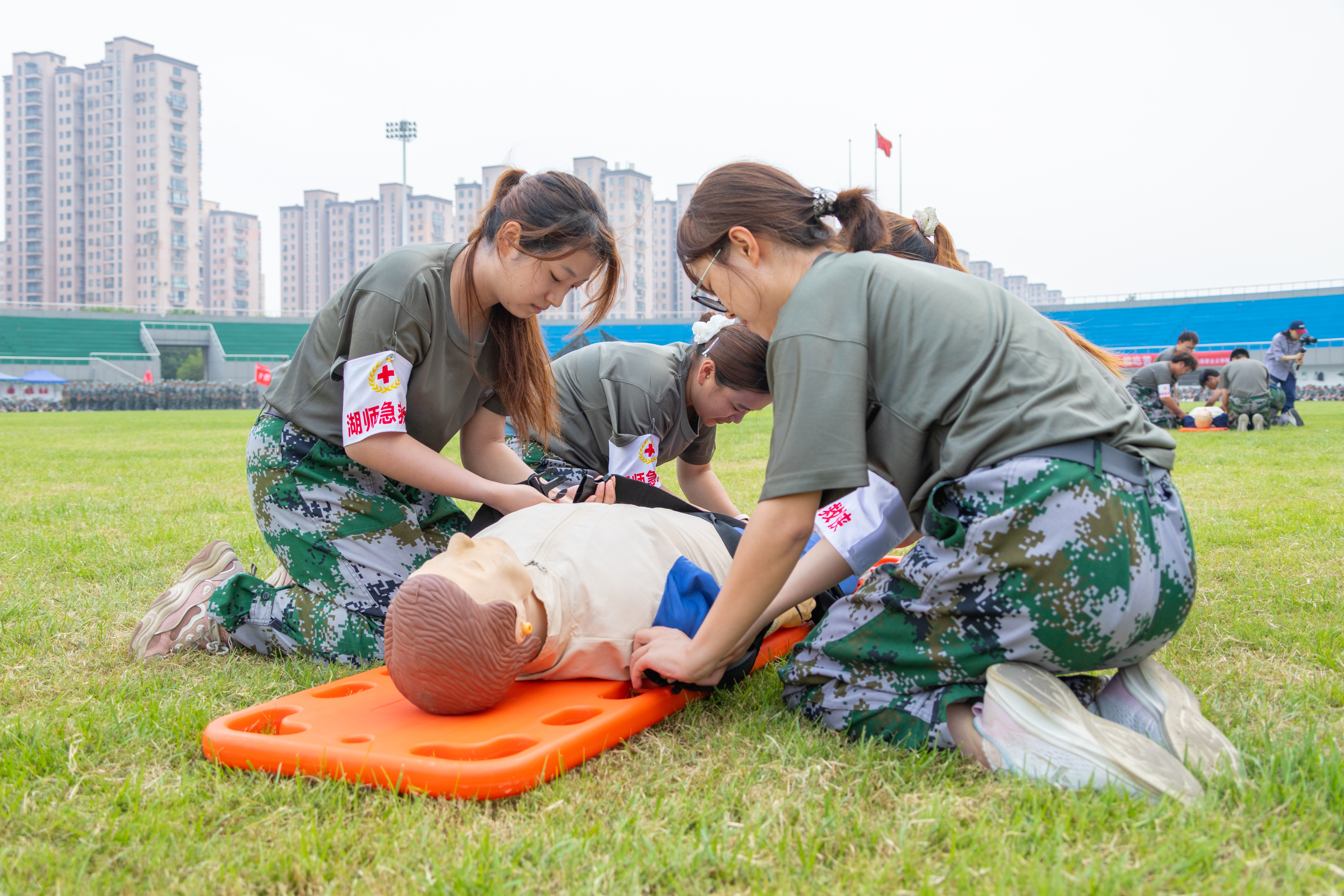 9月29日的军训汇报表演上,红十字精神更是绽放光彩。十四营医学院学生化身“生命守护者”,在特色科目展演环节,规范演示心肺复苏、骨折固定与伤员搬运等技术。动作利落、配合默契,他们不仅展现了扎实的急救功底,更将人道主义精神与医者责任感深植于每一位新生心中。
