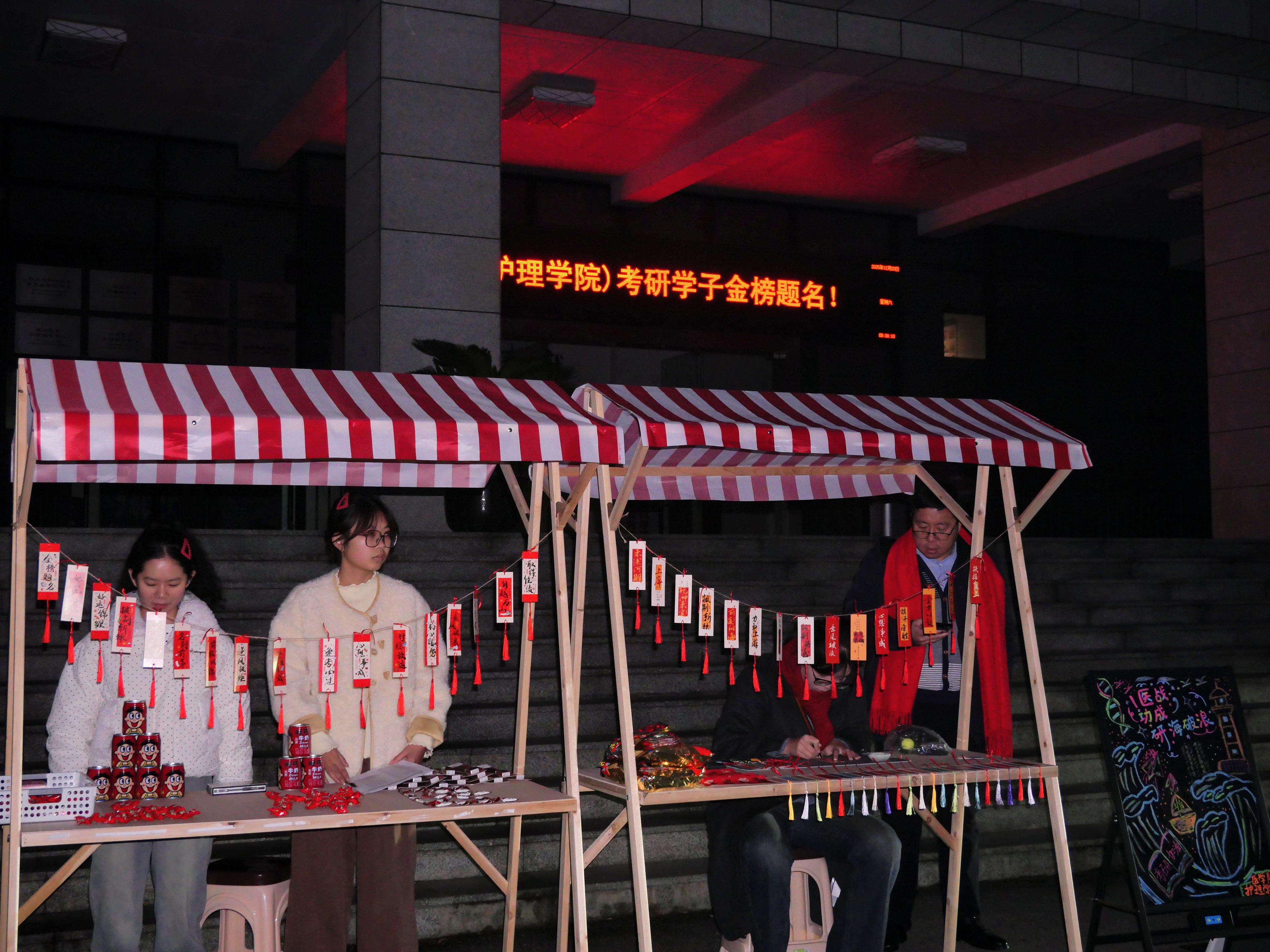 现场以“杏林驿站”为主线,设置了多个服务环节。擅长书法的师生挥毫泼墨,书写“金榜题名”“一举高中”等祝福书签,以墨香传递深情厚望。学院还准备了寓意吉祥的补给物资,如巧克力(寓意“巧”克难题、“力”拔头筹)、旺仔牛奶糖(寓意“最旺的仔”)、粽子(寓意一举高“粽”),以及暖宝宝、备用文具等,细致入微地关怀学子所需。同时,现场播放《我的未来不是梦》《追光者》等励志歌曲,用音乐传递力量,缓解考生焦虑,鼓舞昂扬斗志。