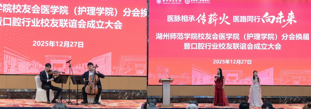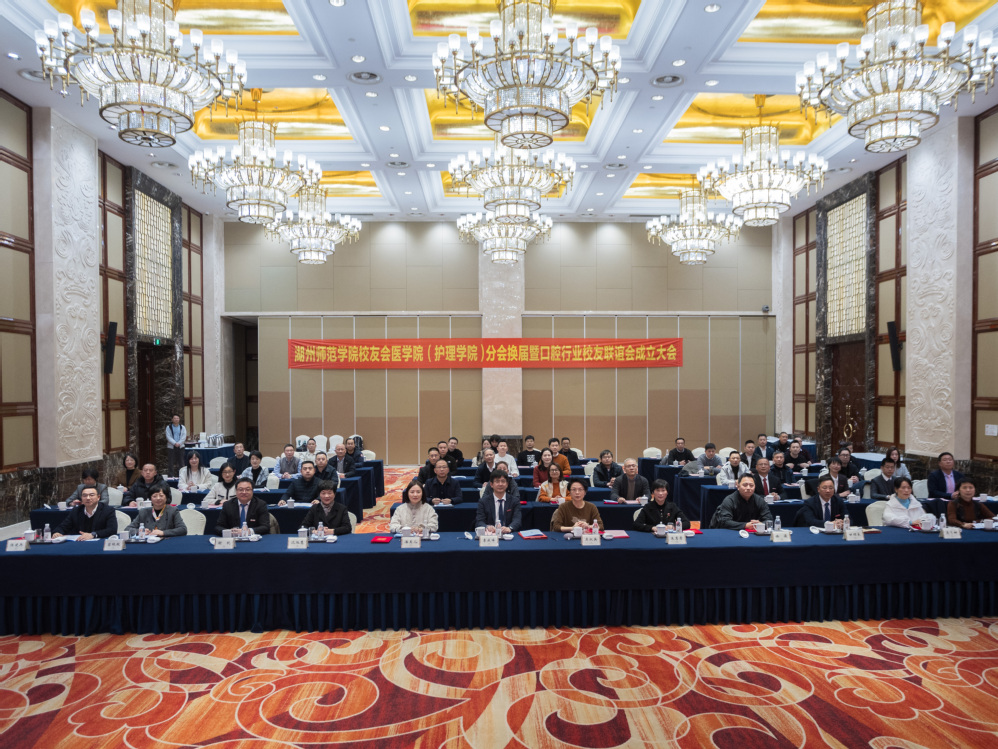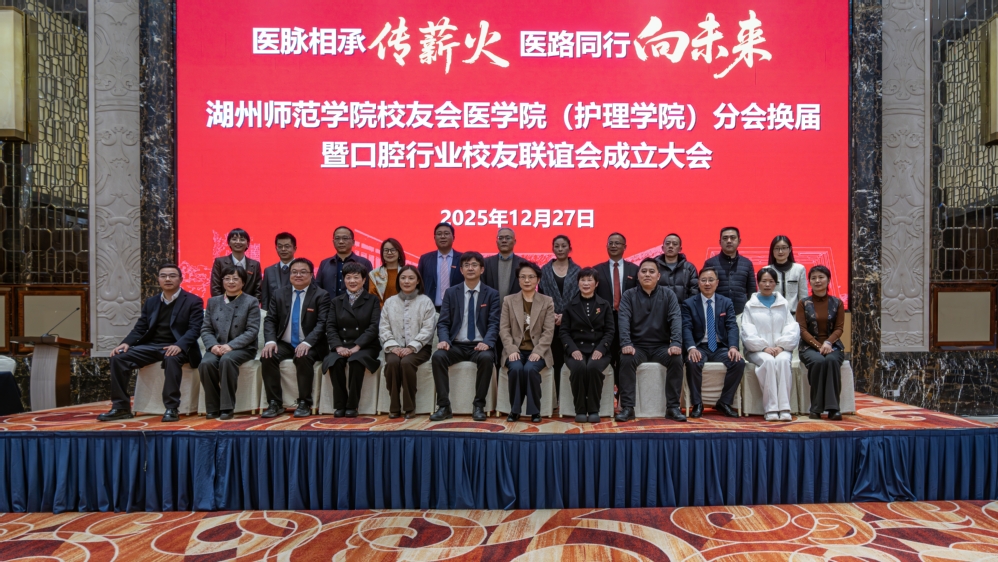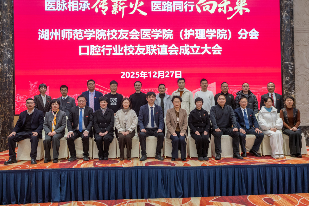 医脉相承,薪火相传;医路同行,情谊绵长。2025年12月27日,湖州师范学院校友会医学院(护理学院)分会换届暨口腔行业校友联谊会成立大会在湖州东吴开元名都大酒店召开。湖州师范学院副校长李庆峰;社会合作与发展联络办公室(校友工作办公室)主任谢杭;医学院(护理学院)党委书记甘顺良携领导班子;95届医士班优秀校友、第一届医学院(护理学院)校友分会会长,大东吴集团党委书记、董事长吴淑英;96届护理优秀校友,第42届南丁格尔奖获得者、浙江省皮肤病医院党委委员、副院长潘美儿;85届优秀校友,全国五一劳动奖章、中非共和国骑士勋章等荣誉获得者,湖州市中医院首席专家、顾问朱惠芳等优秀校友代表及在校师生代表共计70余人齐聚一堂,共叙同窗情谊,共话发展蓝图。会议由医学院(护理学院)党委副书记董建新主持。